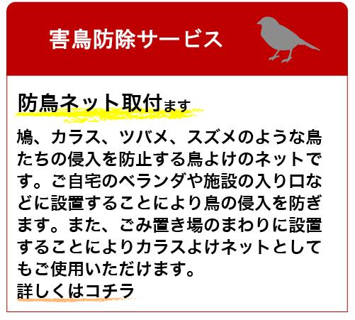 | 害虫駆除サービス | 害獣駆除サービス | 害鳥防除サービス |